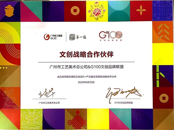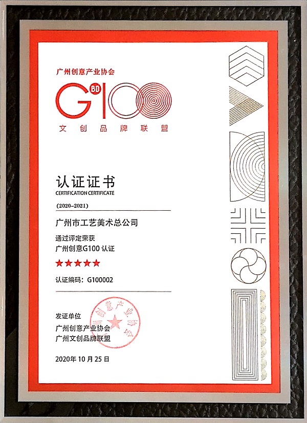 “G100創(chuàng)意100聯(lián)合品牌”是廣州創(chuàng)意產(chǎn)業(yè)協(xié)會、廣州文創(chuàng)品牌聯(lián)盟與GBDO組委會發(fā)起的聯(lián)盟認證,在廣州市文化體制改革與文化產(chǎn)業(yè)發(fā)展辦公室指導支持下建立,從創(chuàng)作與提升廣州城市品牌形象的指導思想出發(fā),與各文創(chuàng)行業(yè)、企業(yè)一起產(chǎn)融共建。本次通過認證,是相關(guān)機構(gòu)對廣州市工藝美術(shù)總公司致力于文創(chuàng)產(chǎn)品設計研發(fā)、活化非遺、廣州IP文旅點合作開發(fā)的認可。