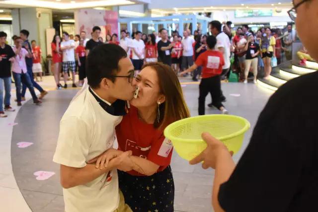 第二個(gè)環(huán)節(jié)是見(jiàn)證愛(ài)情的速度與激情,男女方需要用嘴對(duì)嘴的方式把愛(ài)的撲克牌運(yùn)到舞臺(tái)的另一端,邊跑邊親親,臉紅心跳有木有~~~